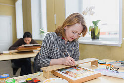 - Осознание того, что хочу писать иконы, пришло с периодом воцерковления, в котором большую роль сыграла моя бабушка. В то время не принято было ходить в храм. Бабушка же открыла мне таинственный мир церковных богослужений и передала любовь к иконам. Мне стало это близко и понятно, и я нашла себя. Проходя обучение в Палехском художественном училище имени М. Горького, я уже знала, что никогда не буду заниматься лаковой миниатюрой. С благословения на иконописание, полученное у о. Моисея в с. Парское, начался мой путь иконописца. В рамках программы училища мне разрешили копировать образцы иконописи, а впоследствии даже написать лики. Первой моей работой стала «Троица», икона палехского письма, которая стала результатом долгого и кропотливого труда. По окончании училища вышла замуж, родила ребёнка, а затем волею судьбы оказалась в Мастерской «Палехский Иконостас». Как сейчас помню, вот так же как с Вами сидели друг напротив друга, и первый вопрос, который задала Наталья Владимировна (прим. – главный художник Мастерской), – С какой целью Вы пришли сюда? - Я ответила, что хотела бы всему научиться, пройдя все этапы иконописания. С её слов «давайте попробуем» и начался мой путь в Мастерской «Палехский Иконостас». Тогда, в 2003 г., я попала на знаковый для Мастерской заказ – иконостас в Сарове. Перед тем, как доверить мне большую работу, Наталья Владимировна дала маленькие иконки святого Серафима Саровского, размером всего 18*21 см, чтобы понять мой уровень. Мы до сих пор так делаем – новичкам даём икону, как самостоятельную работу, чтобы понять, что человек умеет, и какой этап работы у него лучше всего получается.