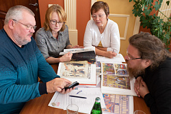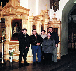 Во-вторых, так совпало, что в это же время у нас состоялась встреча с однокурсниками по случаю десятилетия окончания училища. Мы разговорились с одним из них – Андреем Дмитриевым. Оказалось, что он уже 10 лет занимался не лаковой миниатюрой, как мы, а реставрацией, иконописью и мечтал написать целый иконостас. Мы предложили ему попробовать поработать с нами над этим проектом, и он согласился. Андрей стал нашим художественным руководителем, проектировал иконостас, делал первые рисунки к иконам. Мы с Наташей (прим. – женой), Юрой писали иконы.