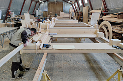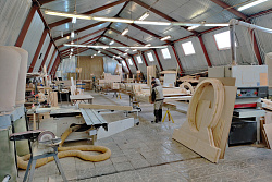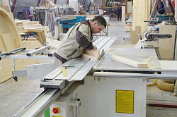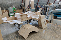 Обычно все этапы изготовления иконостаса параллельно выполняются разными бригадами. В данном проекте сначала столяра заготавливали тело. Затем в цехе ЧПУ на теле иконостаса вырезалась резьба. Далее шла подгонка.