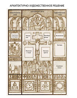 После переговоров с заказчиком, главный художник приступила к выполнению эскиза. Было сделано несколько вариантов. Но в результате заказчику понравилось решение с резным распятием, и писаными иконами двунадесятых праздников, святой Троицы с предстоящими пророками, семейной иконы.
