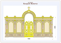 По эскизу, предоставленному заказчиком, выполнили 3D-модель иконостаса, разрезы, оформление Царских врат, дьяконских дверей, заполнение резьбой. Царские врата заказчик попросил оформить орнаментально.