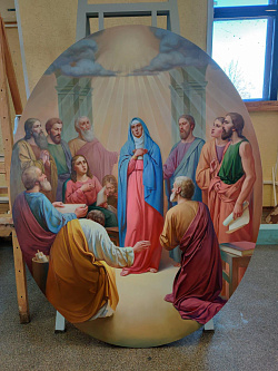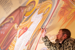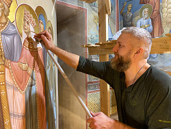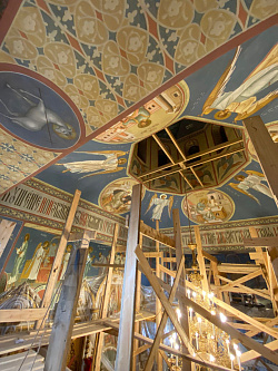 Самый масштабный проект года – роспись Никольского храма в г. Березники Пермского края. Объем росписи – более 4000 м2. Начало работ – июль 2021 г. Окончание работ – ноябрь 2022 г. Несмотря на очень строгие требования к организации производственного процесса, работу удалось выполнить в срок на очень высоком художественном уровне.