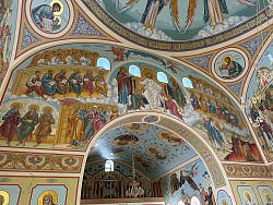 Композиции крупные – в ширину 1,3 м, в высоту 6-7 метров. На западной стене – Страшный Суд, на северной – богородичная композиция «О Тебе радуется», на южной – житие Николая Чудотворца.
