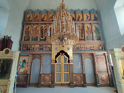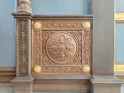 Четырехрядный иконостас из бука размером 7,5*7,85 метров выполнен в древнерусском стиле с классическими тяблами и вертикальными стойками. Тело иконостаса обильно украшено резьбой и окрашено высококачественным красителем немецкой фирмы Оли-Бейц в цвет мореного дуба. Резьба царских врат с сенью и коруной над ней покрыта сусальным золотом.