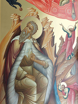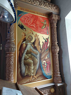 Писать иконы для местного храма – большая ответственность. Мы постарались максимально приблизиться к стилистике Палеха. Для иконостаса характерен тонкий ажурный пробел, холодные тона. Храм посвящен святому Илии Пророку, поэтому в местном ряду справа от Спасителя - икона «Огненное восхождение Пророка Илии». Красный цвет доминирует и задает общий ритм. Получилось по-палехски, ярко, нарядно.