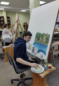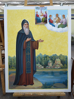 - Список предложил заказчик. Мы подобрали образцы. Знаковая икона – местночтимого святого Евфросина Синозерского. Пейзаж на иконе – восстановленный храм. Это было пожелание заказчика.