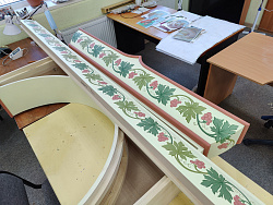 - Да. Он необычный и по цвету, и по написанию, и по архитектуре. Заказчик хотел сделать его максимально простым. Без резьбы, золочения. В иконостасе только фоны икон – золотые. По нижней и верхней балке идет орнамент виноградной лозы. Внизу – пелены, наверху – катапетасма. Её нужно было подобрать согласно орнаменту, задуманному на фризах. Всё это сделано по пожеланию заказчика.