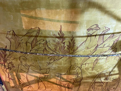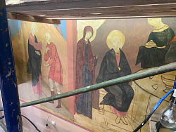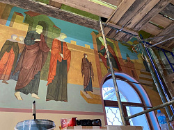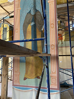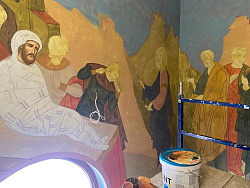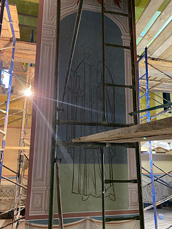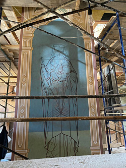 Накануне Нового года завершили первый этап. Расписали потолок, купол, барабан, всю орнаментальную часть, алтарь. Это примерно 60-65% работ.