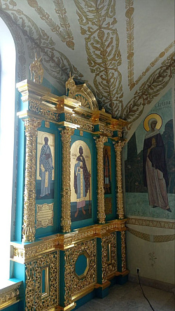 Одноярусный иконостас в стиле нарышкинского барокко, характерного для России XVII века, украшен многоярусной резьбой, ярким колоритом и золочением.