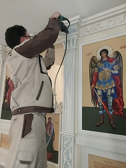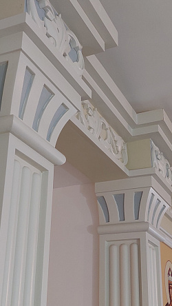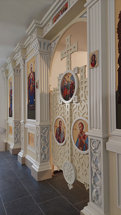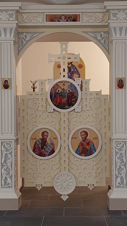 Напомним, это однорядный иконостас, выполненный полностью из МДФ с отделкой светлой эмалью и выкрасками фона. Большая часть элементов иконостаса вырезана на станках ЧПУ.