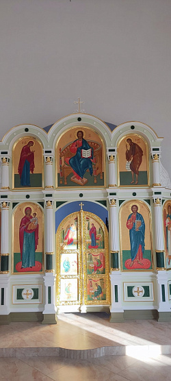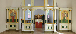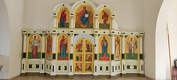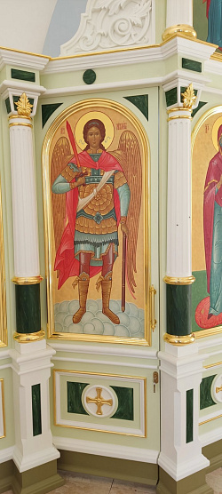 Иконы написали в древнерусском стиле, с цветными фонами. Иконостас получился легкий воздушный с красивыми пробелами. Над проектом работали два пробельщика – Дарья Сулоева и Ксения Сапожникова. Все лики писал один иконописец - Наталья Арапова. Поэтому иконостас получился таким цельным. Выкраски под мрамор делал Евгений Муркин.