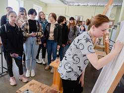 Сегодня в рамках Всероссийского фестиваля «Все медиа детям» в гостях мастерской «Палехский Иконостас» побывали юные участники фестиваля. Сначала начинающим журналистам провели экскурсию по производственным цехам Мастерской, рассказали обо всех этапах изготовления иконостасов. А затем ребята отсняли свой материал для работ, которые они представят завтра.