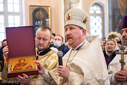 Очень радостно, что Роман остался на престольный праздник, и за 5 минут до начала Божественной литургии делал последние штрихи. Он так же принял участие в освящении храма. Митрополит Минский и Заславский Вениамин вручил Роману и другим иконописцам памятные медали.