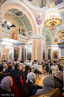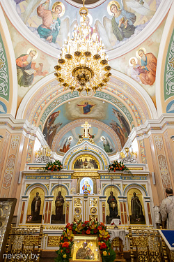 - Да, конечно. Два образа святого – старинная аналойная икона с частицей мощей святого, и икона, подаренная святейшим патриархом Алексием II при посещении Белоруссии в 1995 г. В иконостасе и на храмовых стенах три ростовых иконы св. Александра Невского.