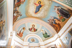В главном храме нужно было заполнить пробелы. Центральная композиция – «Вознесение Господне». При разработке рисунков этот сюжет расположили в центре. Плотно работали с иконописцем Романом Пономарёвым, все нюансы, сложные моменты критично обсуждали.