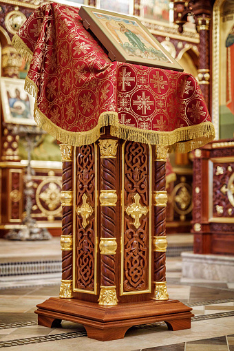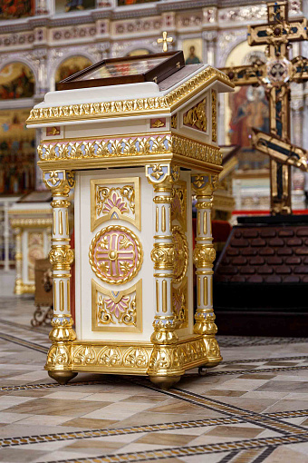 Престол, жертвенник, горний престол, аналой, храмовая мебель для хранения облачений.